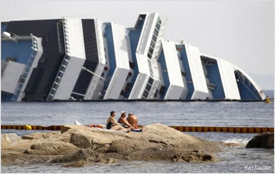 -- 意大利吉廖岛,度假者正在海滩上享受日光浴,不远处是倾覆的“歌诗达协和号”邮轮